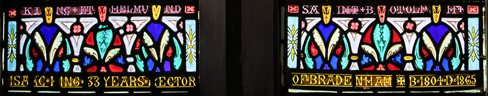 Base of window, and dedication inscription: "Isaac King 33 Years Rector of Bradenham - Born 1804 Died 1865".