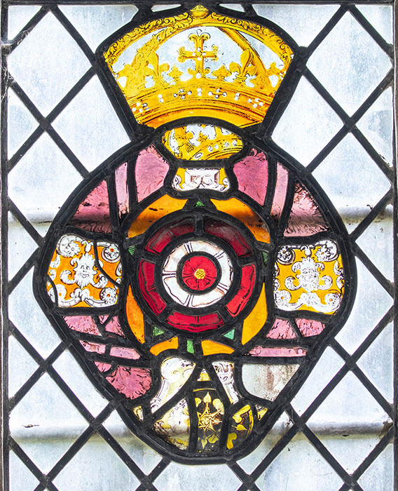 LOWER CENTRE LIGHT, 16C: - A Tudor Rose, surrounded by other fragments, possibly arranged by the stained glass artist Geoffrey Webb, c1926.